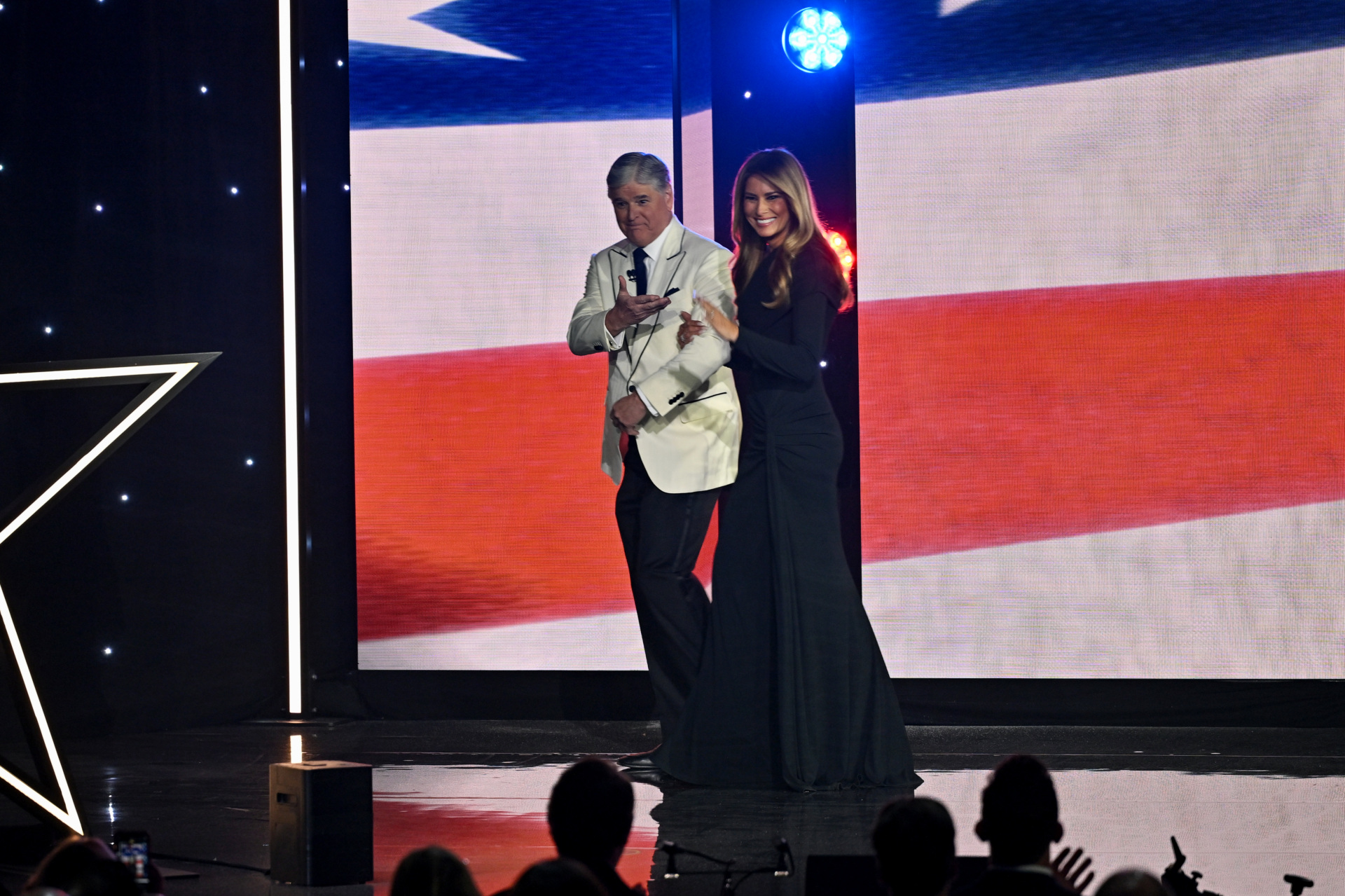 Sean Hannity and First Lady of the United States Melania Trump appear onstage during the 2025 Fox Nation Patriot Awards at Tilles Center for the Performing Arts on November 06, 2025 in Greenvale, New York. (Photo by Roy Rochlin/Getty Images)