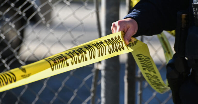 A San Mateo County Sheriff officer puts up police tape at a crime scene after a shooting at the Spanish Town shops in Half Moon Bay, California, on January 24, 2023. – A suspected gunman was in custody Monday over the killing of seven people in a rural community in northern California, just two days after a mass shooting at a Lunar New Year celebration near Los Angeles. (Photo by Samantha Laurey / AFP) (Photo by SAMANTHA LAUREY/AFP via Getty Images)